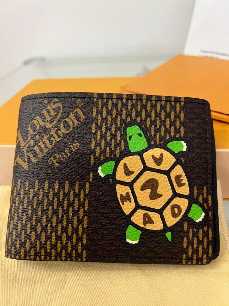 The wallet stands out immediately with its oversized Damier Ebene checkerboard pattern, a twist on Louis Vuitton’s classic motif. The real eye-catcher is the cartoon-style tortoise stamped with “LV Made” across its shell. This playful detail reflects NIGO’s quirky design language and gives the piece a collectible, artistic vibe.