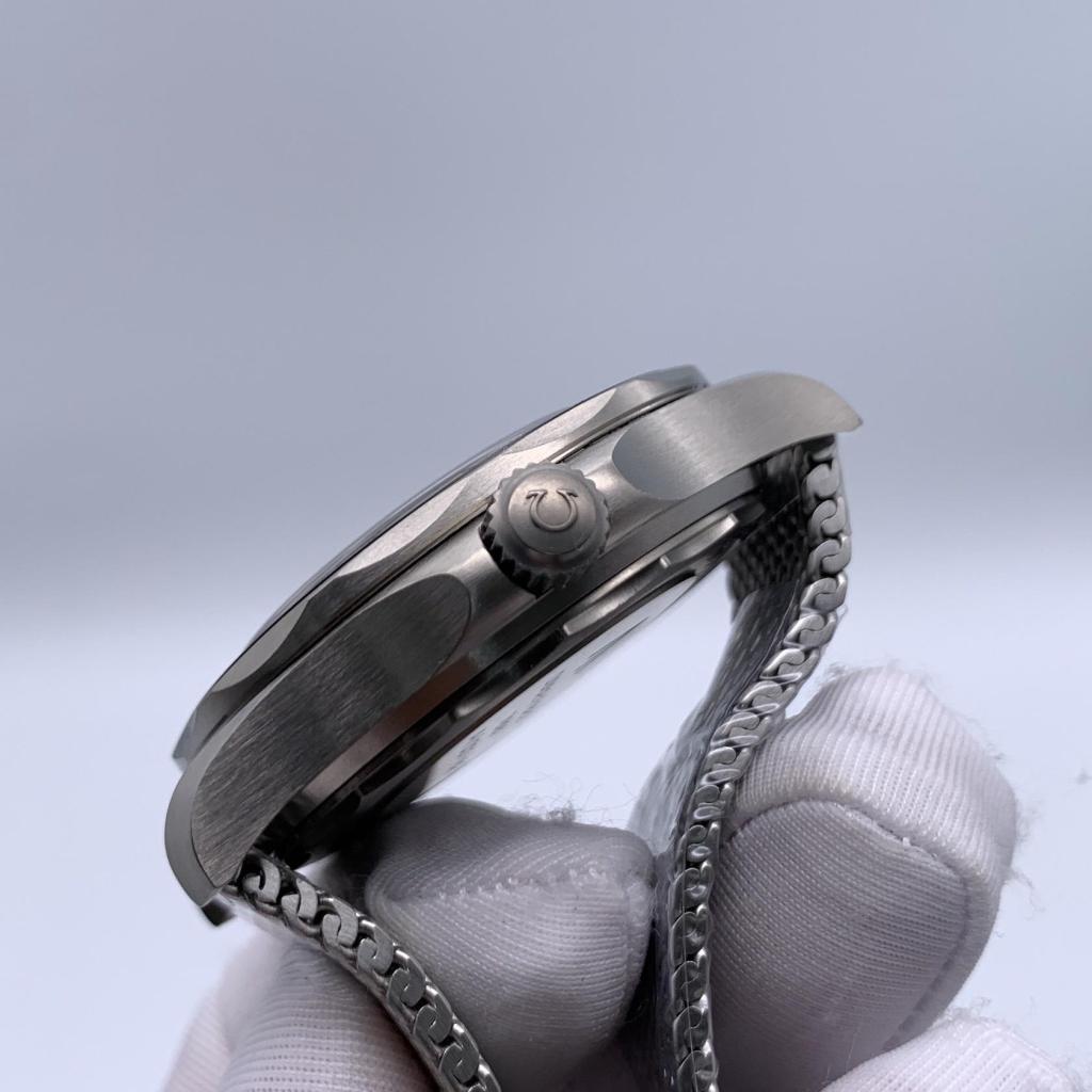 The front view of the Seamaster 007 Edition Watch replica showcases its elegant and robust design. The black dial features large, luminescent hour markers and hands, ensuring excellent visibility. The bezel is well-crafted, with clear numerals and markers, though you mentioned a slight variance in color compared to the genuine Omega. The bezel’s design remains visually striking, adding character to the watch.